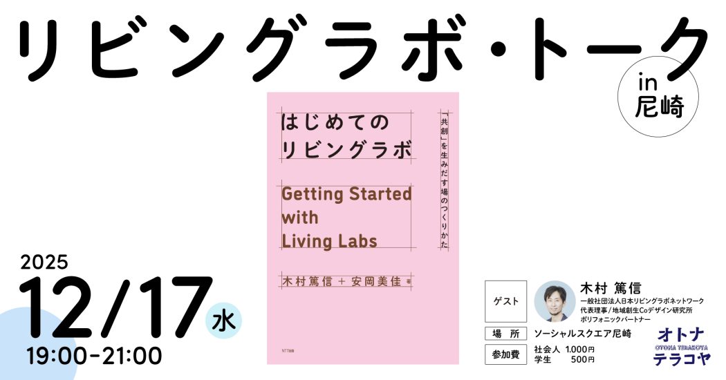 今回は、尼崎おせっかい会議実行委員会主催で、リビングラボ・トーク in 尼崎を開催します。コミュニティナース/福祉施設管理者/ユースワーカー/まちづくりプレイヤーなどの地域の関係者が集まり、共創プラットフォームをつくっていく中で、市民発のリビングラボ事例や、福祉テーマと重なるリビングラボ事例などを木村篤信さんが話題提供し、株式会社ここにある藤本遼さんを聞き手に、これからの尼崎での共創のあり方について対話します。